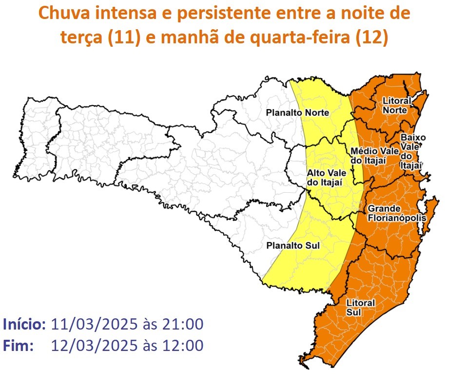 A previsão do tempo divulgada pela Defesa Civil estadual indica que a partir da tarde desta terça-feira (18), a possibilidade de temporais isolados em toda Santa Catarina, sendo risco alto para ocorrências associadas a alagamentos e enxurradas pontuais na região da Costa Verde & Mar e Costa Esmeralda.