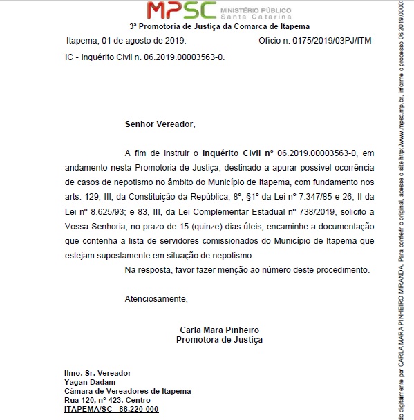 Contudo, nesta tarde, 08/08, recebemos em primeira mão a instauração de inquérito civil n 06.2019.00003563-0 da 3º Promotoria de Justiça da Comarca de Itapema, instaurado pela promotora Carla Mara Pinheiro, afim de apurar possíveis ocorrência de casos de nepotismo no âmbito da Gestão Nilza Simas (PSD). Solicitou ainda, a Promotora Carla, com fundamentos na Lei indicação de prazo de 15 (quinze) dias úteis, para que o Governo acusado de nepotismo encaminhe a documentação com a íntegra, ou seja, lista de servidores comissionados suspeitos de integrarem a suspeita de nepotismo na prefeitura, requereu