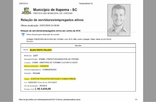 Elias Festa Paludo, atual presidente do PDT, receberá pela contratação R$3.624,95 Reais, passou a ocupar um cargo este que tem por alcunha “chefe de projetos especiais comunitários” como designa seu sobrenome, o dinheiro público que se fosse levado a sério não seria uma “festa” bem sugestivo.