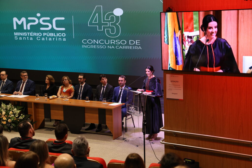 A recém-empossada Promotora de Justiça Camila da Silva Tognon fez o discurso em nome dos novos integrantes do MPSC. Emocionada, Camila lembrou a jornada de estudos, provas e desafios até chegar ao tão sonhado momento da posse. “A trajetória não foi nada fácil. Aliás, eu costumo falar que essa jornada foi qualquer coisa menos fácil. Estudar nunca é fácil. Estudar envolve renúncia, exige esforço, sacrifício, exige que nos deparemos com a nossa ignorância e que acreditemos em um futuro incerto. Estudar vai de encontro à satisfação imediata inerente ao ser humano e exige muita, mas muita resiliência. No entanto, ainda assim persistimos, afinal um sonho custa caro, mas desistir nos custaria um sonho! Lutamos contra todas as circunstâncias negativas e hoje estamos aqui comemorando essa conquista tão sonhada e esperada que é fazer parte, ouso aqui falar, do melhor Ministério Público do Brasil: o Ministério Público catarinense”, disse.