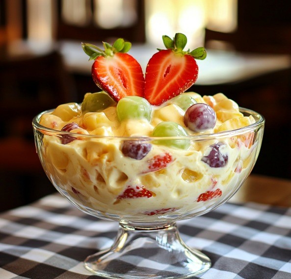 Refrescante, cremosa e cheia de sabor, essa Salada de Frutas Cremosa é a sobremesa perfeita para qualquer ocasião! O creme suave feito com leite condensado, creme de leite e suco concentrado de maracujá combina perfeitamente com frutas frescas e coloridas. Além de deliciosa, ela é fácil de preparar e pode ser personalizada com as frutas que você mais gosta. Sirva gelada e surpreenda sua família com essa explosão de sabores!