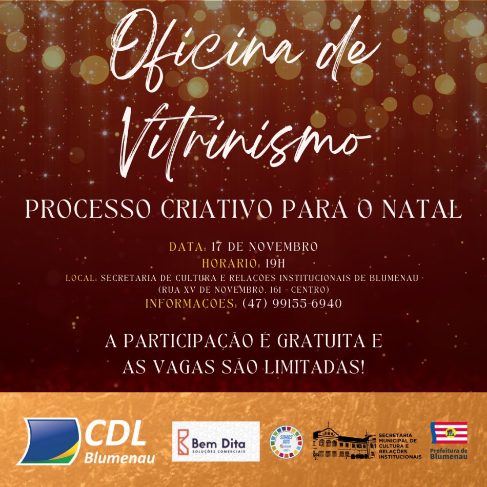 A Secretaria Municipal de Cultura e Relações Institucionais de Blumenau (SMC) recebe a Oficina de Vitrinismo e Processo Criativo , com foco no NATAL promovida pelo CDL Blumenau nesta quarta-feira, dia 17, às 19h. O objetivo é auxiliar os lojistas no desenvolvimento de vitrines criativas para atrair mais clientes neste fim de ano.