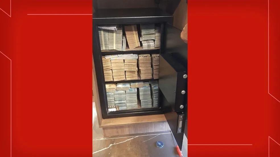 Os mandados são cumpridos no DF e em três estados. Segundo a PF, houve suposta movimentação de R$ 8 milhões com as fraudes. Os malotes de dinheiro foram identificados enquanto policiais federais cumpriam um dos mandados de prisão temporária em Brasília. As imagens mostram maços de reais e dólares lotando três prateleiras do cofre. Segundo a PF, a estimativa inicial é de que haja mais de R$ 4 milhões só nessa apreensão. O valor exato ainda será apurado. Além do dinheiro, também foram encontrados medicamentos para a disfunção erétil no cofre.