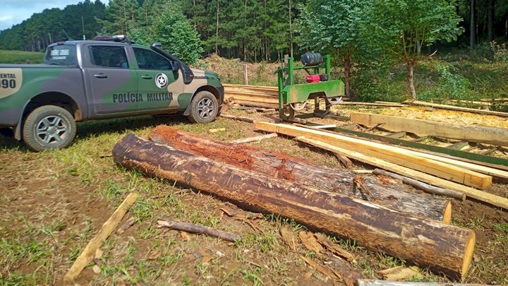 Durante policiamento na localidade de Faxinal dos Ferreiras, a guarnição se deparou com madeira nativa serrada e algumas toras de Pinheiro Brasileiro (Araucária angustifolia). Além disso, foi encontrado no local uma serraria móvel utilizada para o beneficiamento dessa madeira.