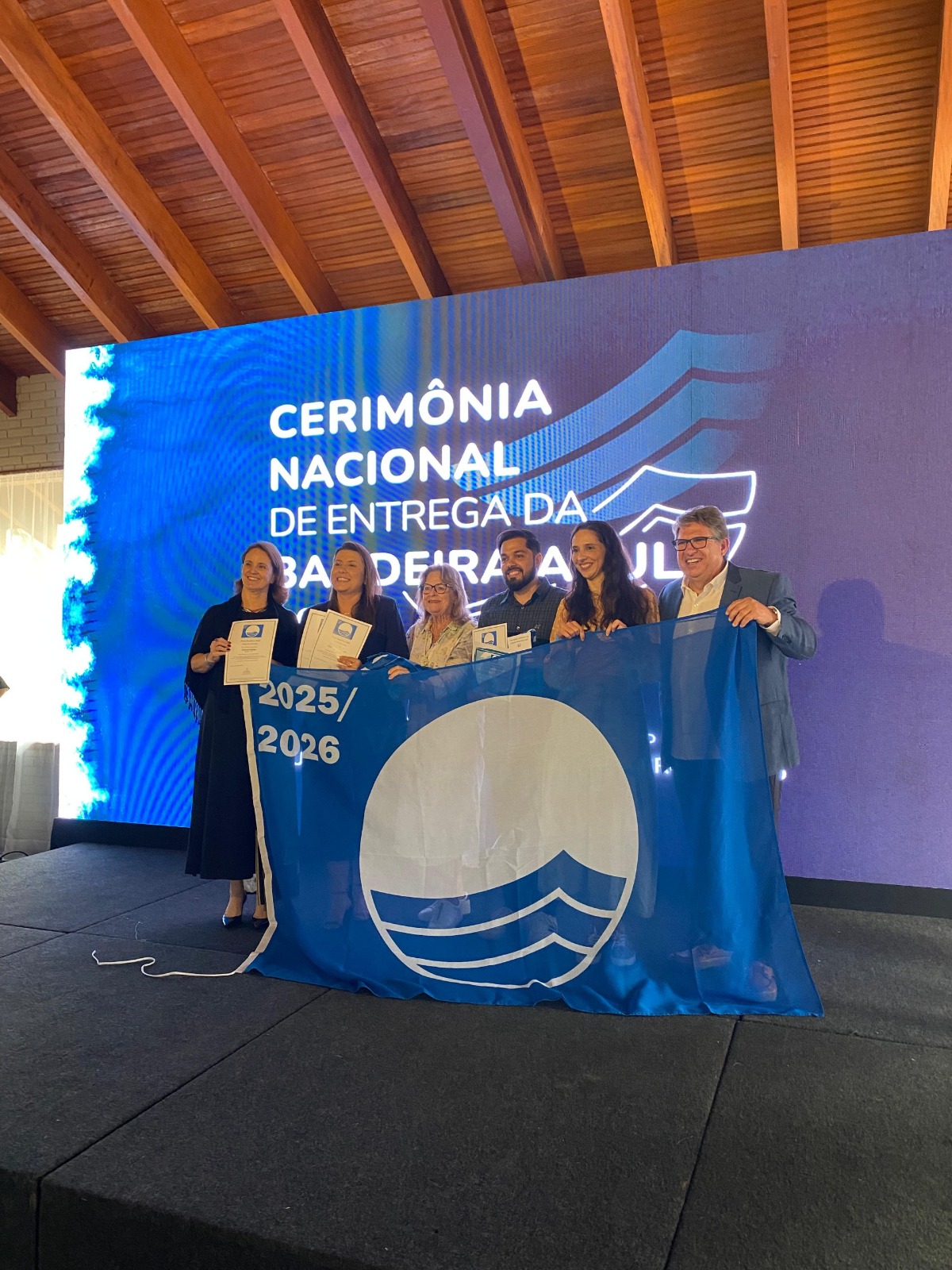 Penha recebeu nesta sexta-feira, 31 – em cerimônia realizada no Guarujá (SP) – as quatro bandeiras azuis que irão tremular nos balneários de Penha para a Temporada 2025/2026: Bacia da Vovó, Praia da Saudade, Praia Grande e Praia Vermelha ganharam o direito de hastear a reconhecida bandeira azulada, símbolo mundial de qualidade ambiental.