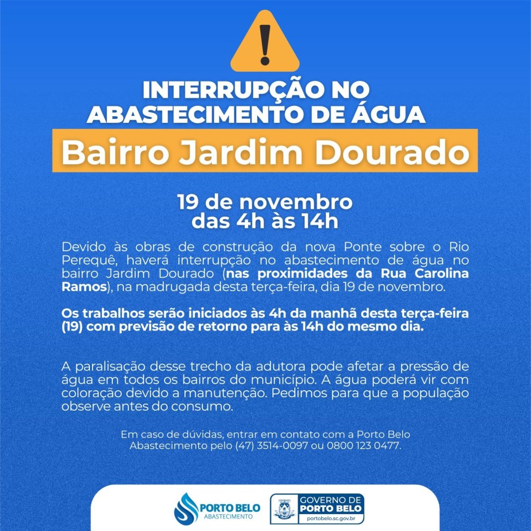 O Governo de Porto Belo, através da Porto Belo Abastecimento, informa que haverá interrupção no abastecimento de água no bairro Jardim Dourado – nas proximidades da Rua Carolina Ramos -, na madrugada desta terça-feira, dia 19 de novembro. A interrupção acontecerá por conta das obras da Ponte do Rio Perequê.