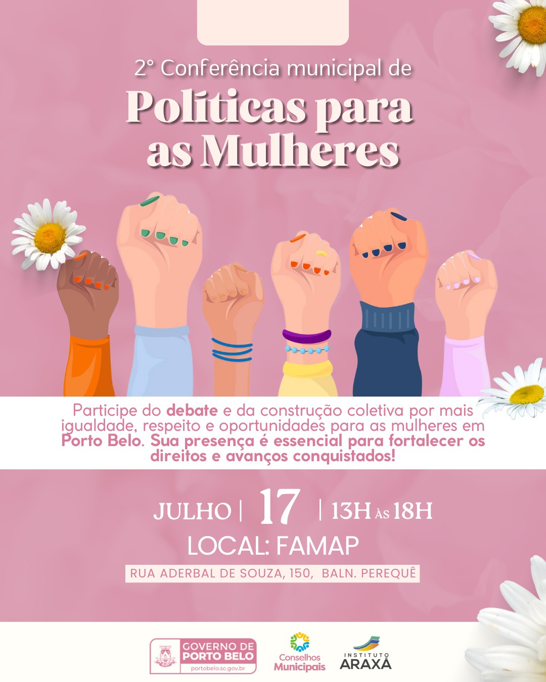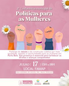 O Governo de Porto Belo, por meio dos Conselhos Municipais, divulga a data da 2ª Conferência Municipal de Políticas para as Mulheres, anteriormente cancelada, que será realizada no dia 17 de julho, das 13h às 18h, na Fundação Municipal do Meio Ambiente, localizada na Rua Aderbal de Souza, nº 150.