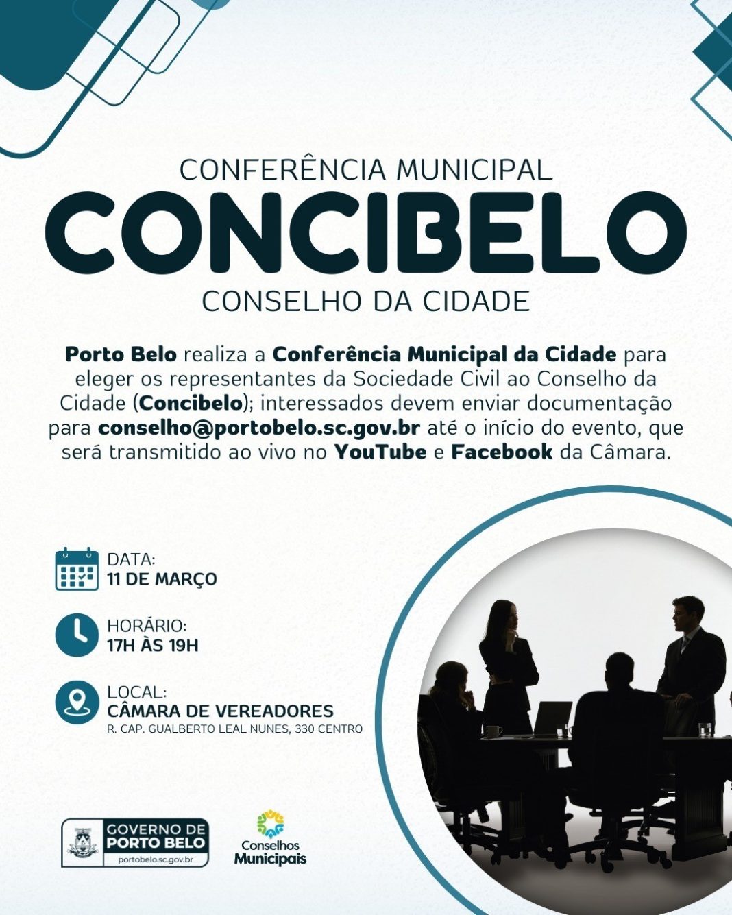 O Governo de Porto Belo está convidando para a Conferência Municipal da Cidade que elegerá os representantes da Sociedade Civil para a comporem o Conselho da Cidade de Porto Belo – Concibelo. O evento será realizado no dia 11 de março, entre 17h e 19h, na Câmara de Vereadores local, localizada na rua Capitão Gualberto Leal Nunes, nº 330, bairro Centro.