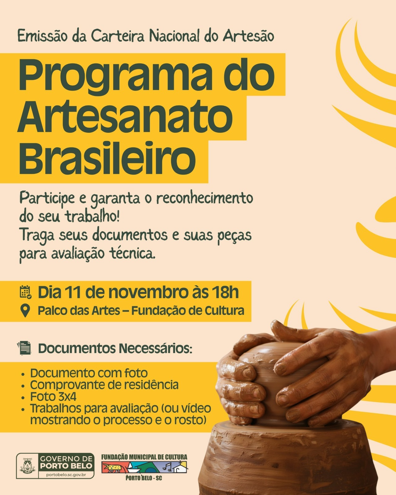 O Governo de Porto Belo, por meio de sua Fundação Municipal de Cultura realiza na próxima segunda-feira, dia 11 de novembro, às 18h, no Palco das Artes, a ação de emissão da Carteira Nacional do Artesão, iniciativa vinculada ao Programa do Artesanato Brasileiro (PAB).