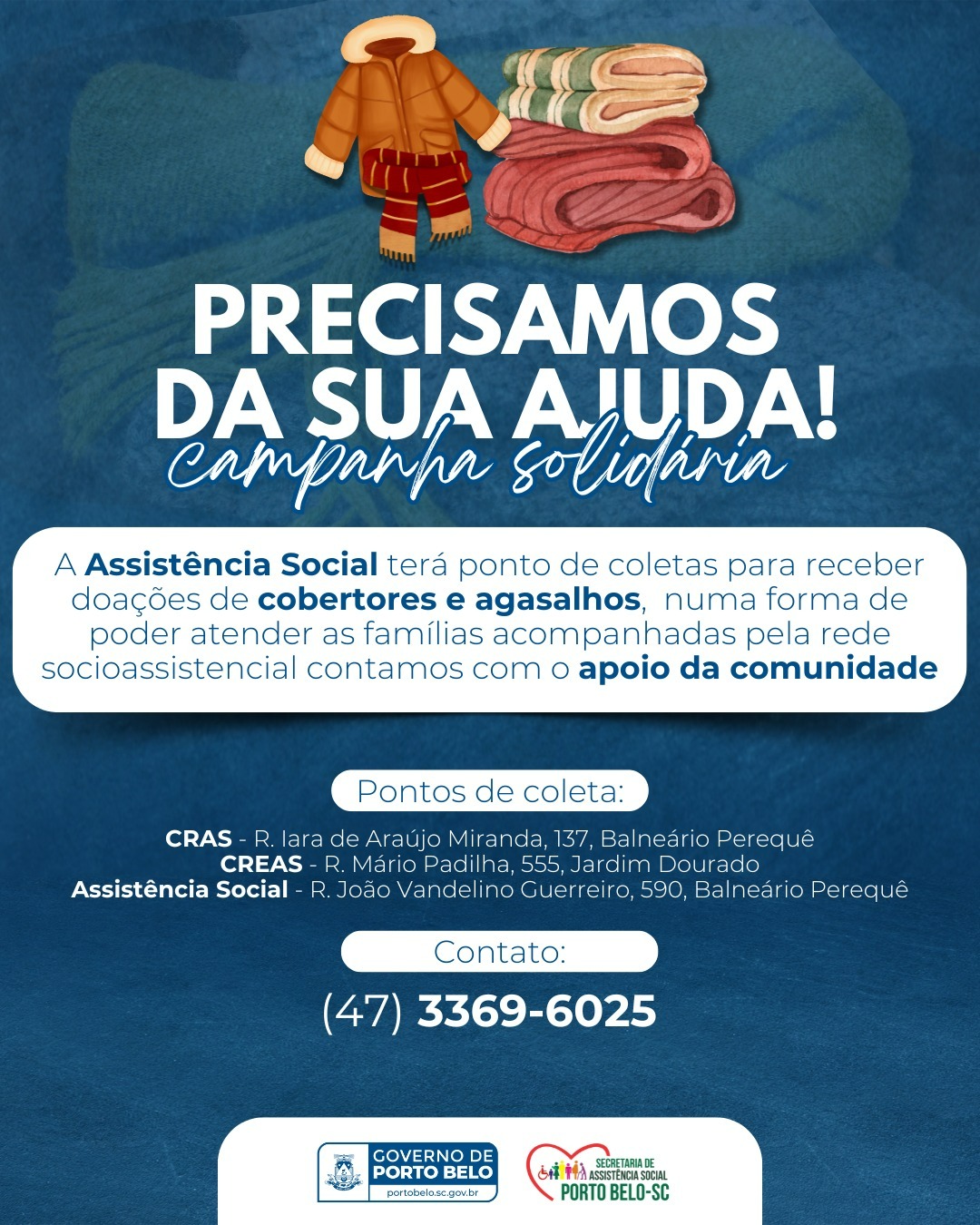 A secretaria de Assistência Social de Porto Belo está promovendo uma campanha solidária com o objetivo de arrecadar cobertores e agasalhos para atender as famílias acompanhadas pela rede socioassistencial do município.
