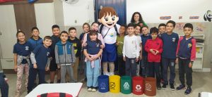 Na sequência, os alunos aprendem de forma prática: a separação pode começar em casa com apenas duas sacolinhas de lixo, e quando vão para a rua, podem usar as lixeiras coloridas, cada uma destinada a um tipo de resíduo.