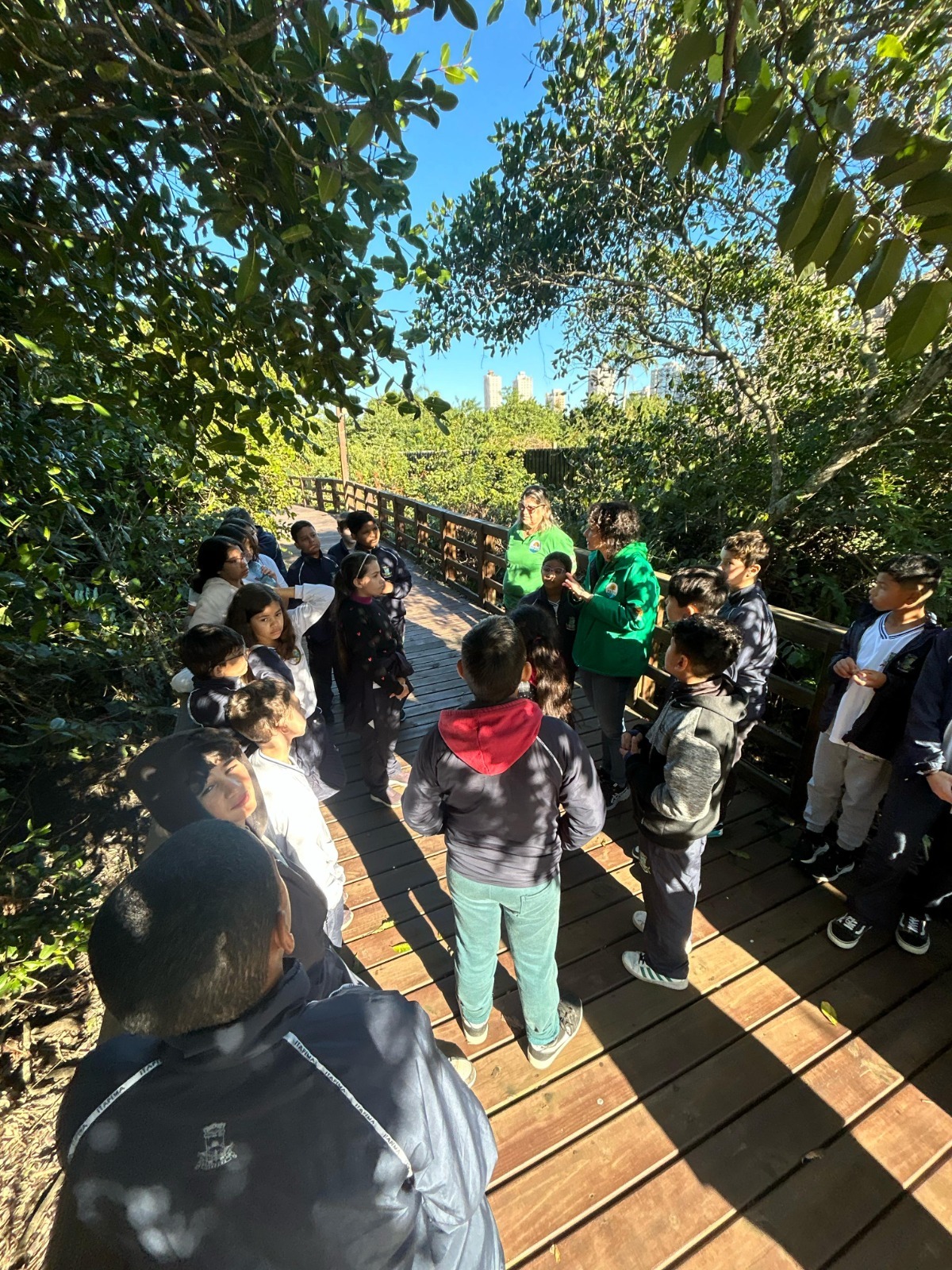 Durante o percurso guiado, os estudantes recebem informações sobre a importância dos manguezais e aprendem a identificar os três principais tipos de mangue, entendendo características específicas de cada um. A experiência também inclui a observação de capivaras, além do avistamento e escuta de diversas espécies de aves que habitam o parque.