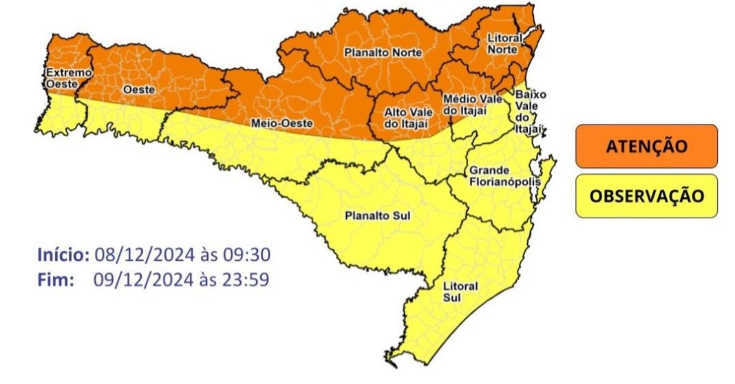 A previsão de tempo, elaborada em conjunto pela Secretaria de Estado da Proteção e Defesa Civil e a pela Epagri/Ciram indica que nesta segunda-feira, 9, o tempo permanece nublado e chuvoso em grande parte do estado, com intensidade pontualmente moderada a forte, mantendo o risco moderado a alto para ocorrências meteorológicas, principalmente nas áreas da divisa com o Paraná, onde a chuva tende a ser mais volumosa, em especial no Extremo Oeste, Litoral Norte, Planalto Norte e parte do Vale do Itajaí.