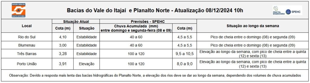 O maior risco segue nas bacias hidrográficas das regiões do Litoral Norte e Planalto Norte, onde o risco segue alto para ocorrências de inundações graduais, enxurradas e alagamentos.