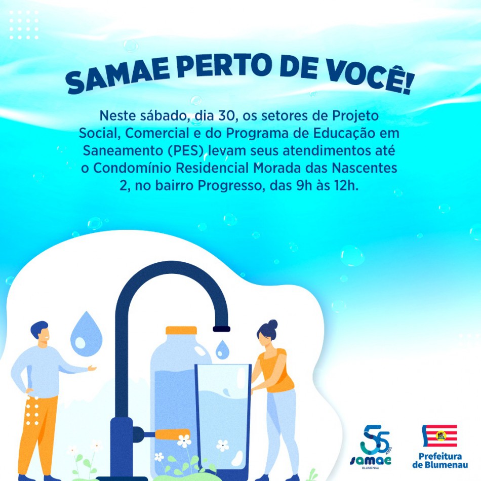 No sábado, dia 30 de outubro, os setores comercial, de projetos sociais e do Programa de Educação em Saneamento (PES) do Samae, levam o projeto “Samae perto de você” até o bairro Progresso. Na ocasião, o Condomínio Residencial Morada das Nascentes II, localizado na rua Santa Maria, n° 2.311, bairro Progresso, receberá o atendimento dos serviços comercial e de projeto social para dúvidas, consultas e novas adesões.