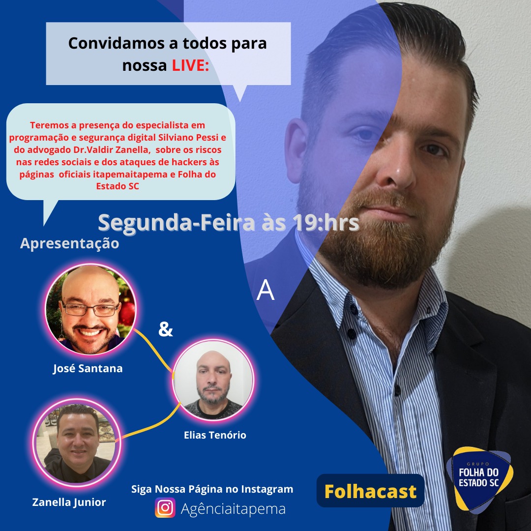Nesta segunda-feira, 11, às 19h30min vamos apresentar uma Super Live com o especialista em segurança digital, Silviano Pessi que falara sobre os perfis dos hackers e das medidas de segurança digital e judiciais que serão tomadas para que a Justiça Brasileira possa garantir o direito de propriedade, administração e dos conteúdos publicados nas páginas fanpages (Itapemaitapema) e (Folha do Estado SC).